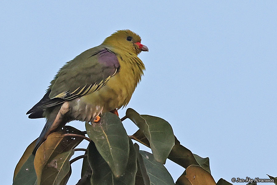 The African green pigeon is one of five green pigeons in Africa. They are all, as the name suggests, green with various touches of other colors. This species is social and often appears in flocks - just like the individual in the picture sitting at the top of a tree with other green pigeons. The flocks usually gather in fruit trees, a favorite being figs. They like to stay when danger approaches, but then fly away in a massed flight with a massive flapping that is sure to disturb the most eager predator.
