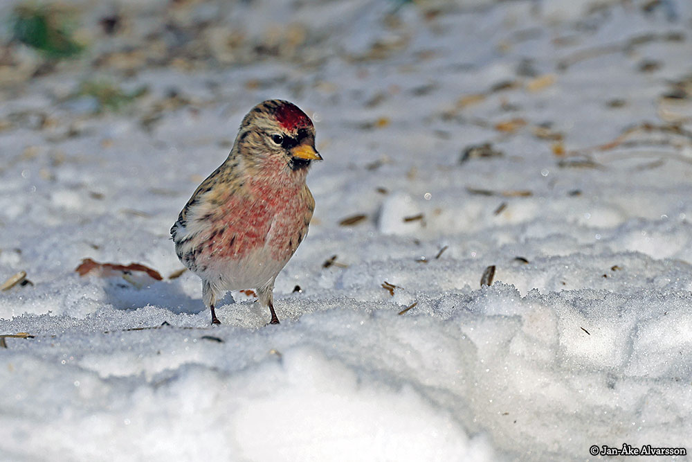 In Swedish, this bird has been given a boring name ("Grey siskin"), I think. This picture clearly shows that it is not only grey but also red-breasted, with a yellow beak in a black area - and a flaming red head! Thus, the English name "Redpoll" is much better!