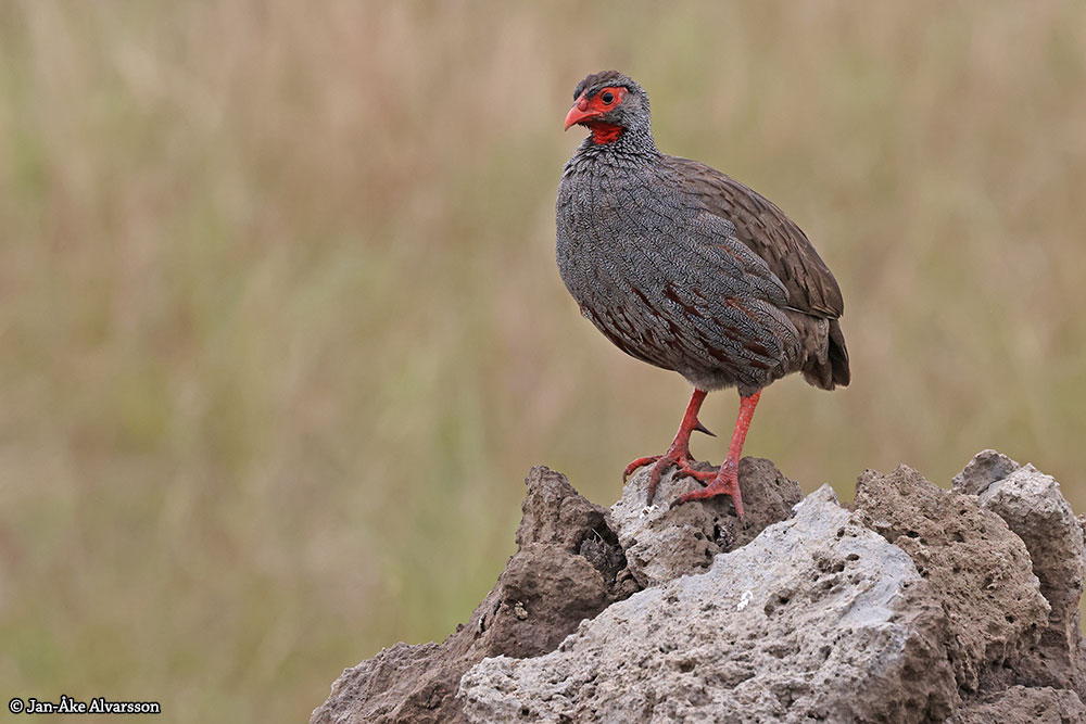 Rödstrupig sporrhöna (eller rödstrupig frankolin) har en vidsträckt utbredning i Afrika söder om ekvatorn. Den trivs i fuktiga områden med täta buskage, skogsbryn och längs flodkanter, men undviker generellt tät urskog. Den har rödaktiga ben, och hanarna har, som på bilden, ofta sporrar (därav det ena namnet). Den är skygg och föredrar att hålla sig nära tätt skydd, även om den kan ses födosöka i öppnare buskmarker eller odlingar om den inte störs. Att se den på en upphöjning som denna sten är därför mycket ovanligt!