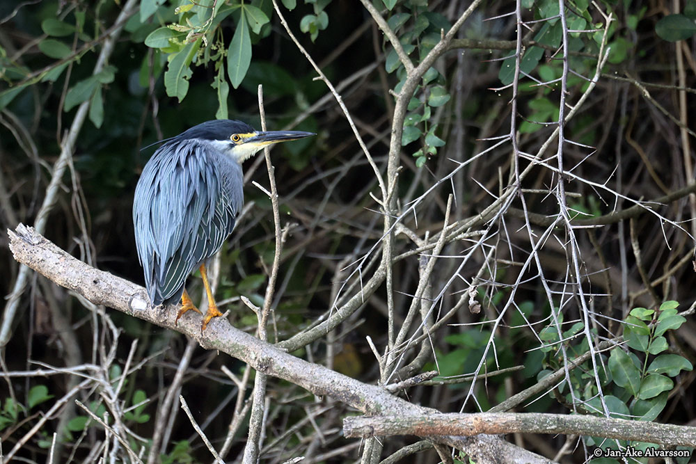 The Little heron is a small, long-billed bird in the heron family. It has a very wide distribution, extending across Africa south of the Sahara, southern Asia and Australia. The body length is 40-48 cm. An adult bird has a dark, often lead or silver-gray upperparts and a black cap with a nape tuft. The sides of the neck can vary from reddish-brown to light beige-gray depending on the subspecies. The species lives mainly in waterside areas, such as mangrove swamps, estuaries, rivers and lakes. It is known for its patient fishing style where it stands still or wades slowly to then quickly catch small fish, crustaceans and insects. The genus Butorides has undergone several changes in recent years. As of 2023, most scientists agree that it consists of four species: Little heron (Butorides atricapilla) in Africa, Asia, Australia and Oceania; Striated heron (Butorides striata) in South America; Galapagos [Lava] heron (Butorides sundevalli) in the Galapagos Islands; and Green-backed heron (Butorides virescens) in North and Central America.