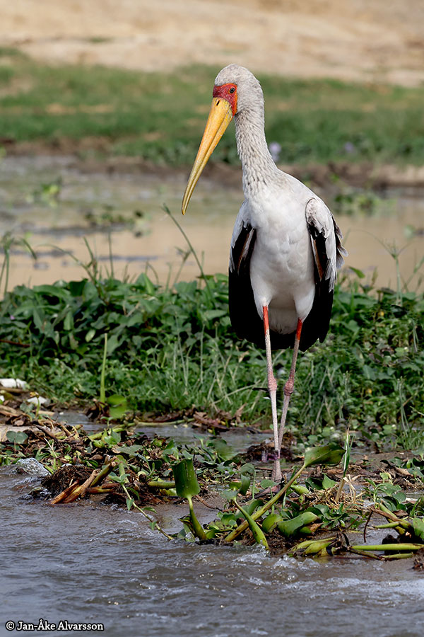 The Yellow-billed stork measures an average of 95 to 105 centimeters in length and has a wingspan of 150 to 165 centimeters. It has a strong yellow bill, a red featherless face, and a large black eye with a small yellow orbital ring. The long legs are red and pink. The species has a wide distribution in Africa south of the Sahara. It is partly a migratory bird and occurs in winter also north of its breeding area, in Egypt for example.