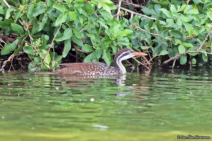 This is a female of the almost legendary African finfoot. Many birdwatchers have heard of it but few have seen it. It has an elongated body that resembles a cormorant or African darter (Anhinga rufa), with a length of between 35 and 65 cm. Its characteristic features are the bright coral-red bill and bright red webbed feet, which make it a skilled swimmer. The male has a dark gray throat while the female has a white throat and a more pronounced white stripe along the side of the neck. The African darter prefers calm, wooded waterways with dense vegetation along the banks, including rivers, lakes and mangrove swamps. The species is extremely reclusive, hiding in the vegetation and is usually seen alone or in pairs and very rarely out in open water. It swims deep in the water with its head nodding back and forth and its tail spread out on the surface of the water.
