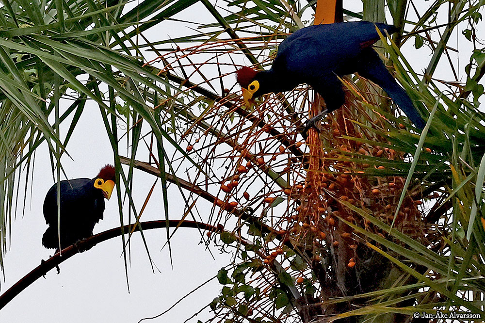 These indigo blue Ross's turacos have golden yellow bills that fade to red. They have a yellow zorro mask and a reddish purple head tuft. They also have a long tail and long legs and in my opinion look somewhat out of place in this palm tree. Something that is not visible in the photo is the crimson undersides of the wings. These are almost only seen in flight. Just like in the photo, yellow-masked turacos eat fruit, fruit and fruit. In some places, their appetite for cultivated fruit is so great that they are considered pests.
