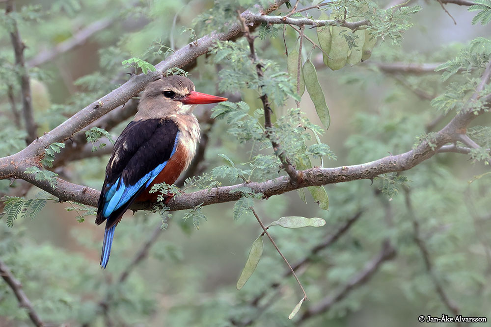 This is a Grey-headed kingfisher in Murchinson Falls National Park. It often lives near water, but, like many king"fishers," it feeds mainly on land animals such as lizards and insects.