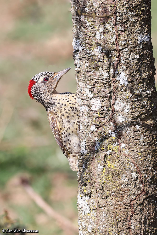 Female Nubian woodpecker foraging in a tree. This species lives in East Africa and thrives best in open savannah, shrublands and sparse forest. It is a medium-sized woodpecker, about 23 cm long. The upper side is olive-brown with white spots, while the underside is yellowish-white with distinct dark spots. The male has a red crown and neck, while the female has a black crown with white spots and red only on the neck. Both sexes have red eyes. The Nubian woodpecker forages in trees as well as on the ground, where it mainly eats ants and termites, but also spiders and beetles. The bird is often seen in pairs or alone and keeps in touch with its partner through loud calls. It is a resident bird and does not make any long-distance migrations.