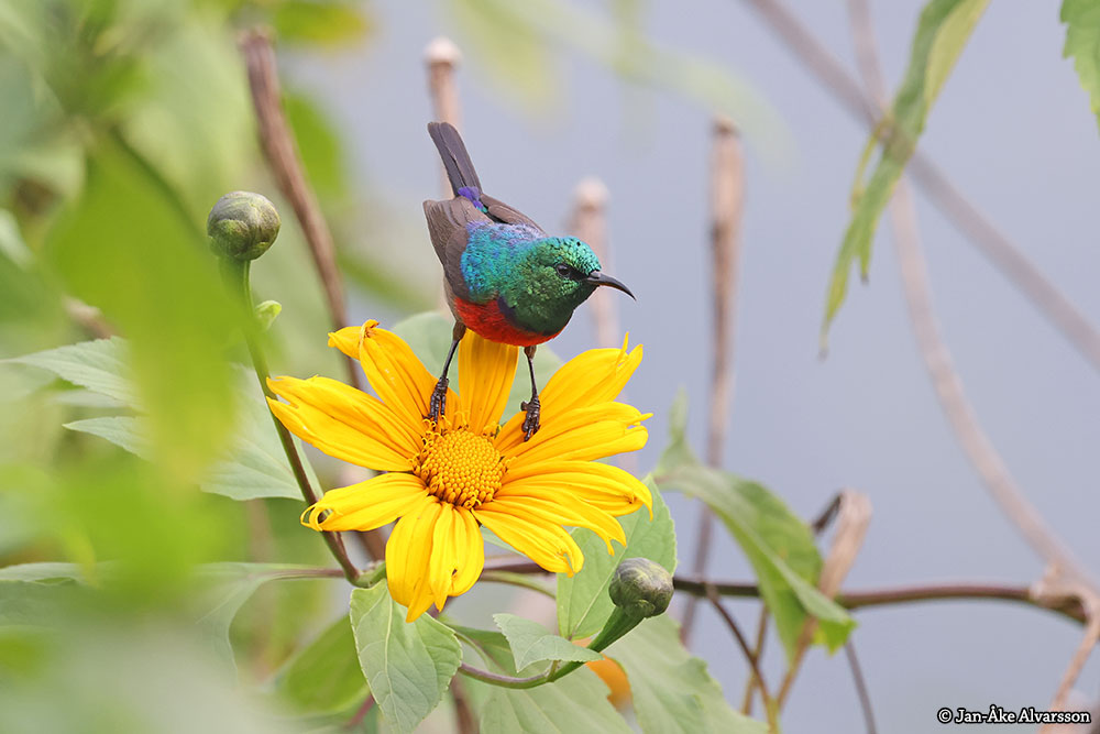 Alldeles utanför min veranda växte dessa gula blommor och en eftermiddag kom denna rödbröstade solfågel på besök... Den var förstås ute efter blommans nektar, en basföda för solfåglar.