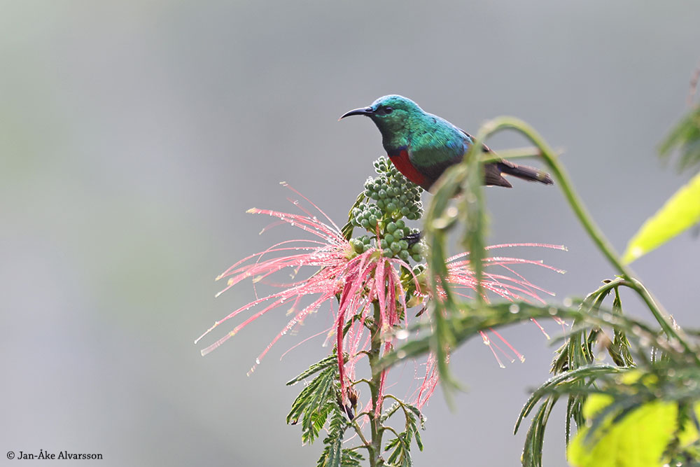Alldeles innanför entrén till Bwindi Impenetrable Forest satt denna rödbröstade solfågel på en elegant blomma.