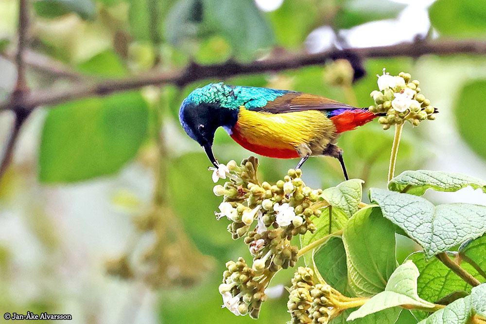 En kungssolfågel som suger nektar från en blomma i Lake Mburu National Park.