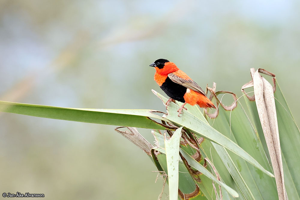 Bilderna jag tog på svartpannad eldvävare i Gambia i november 2024 visade på hanens klarröda färg. Den här eldvävaren i nationalparken Murchinson Falls är betydligt mera orange och visar på färgvariationerna inom arten.