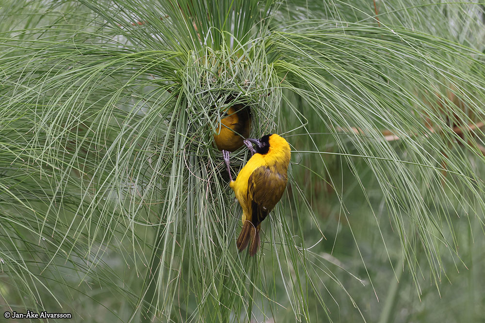 This Slender-billed weaver has built its nest in a papyrus swamp and has managed to use some of the existing straws to build the nest. The male wears a black mask while the female, unusually, lacks markings on her yellow face. Both have unusually long, slender bills for being weavers. The species breeds in various types of wetlands, sometimes also in adjacent savannah and shrubland. Compared to other weavers, it is not as social and is usually seen in pairs or small groups.