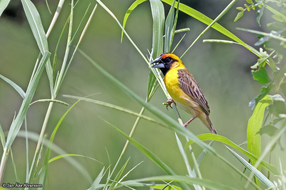 The strong colors are recognizable from other weaver species, but the body shape is different. Look at the strong bill, the compact body and the short tail! Males and females look identical at first glance. However, the male has a solid yellow crown while the female has a black band along the crown. This is therefore a female in the picture. The species' song is also odd because it resembles hissing radio interference. The compact weaver is found in moist, grassy areas in savannah, shrublands and open forests.
